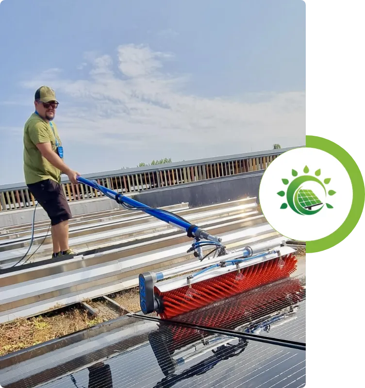 For solar farms, we use SunBrush systems and mobile vehicle-mounted machines. For rooftop systems, we use telescopic brushes with demineralizers and rope access techniques where needed.
